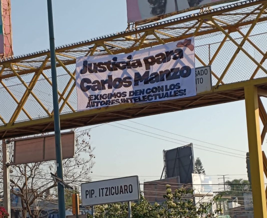 Una lona con la leyenda “Justicia para Carlos Manzo ¡Exigimos den con los autores intelectuales!” fue colocada la mañana de este martes en lo alto de un puente peatonal ubicado sobre la avenida Francisco I. Madero Poniente, casi esquina con la avenida San Juanito Itzícuaro, al poniente de Morelia.