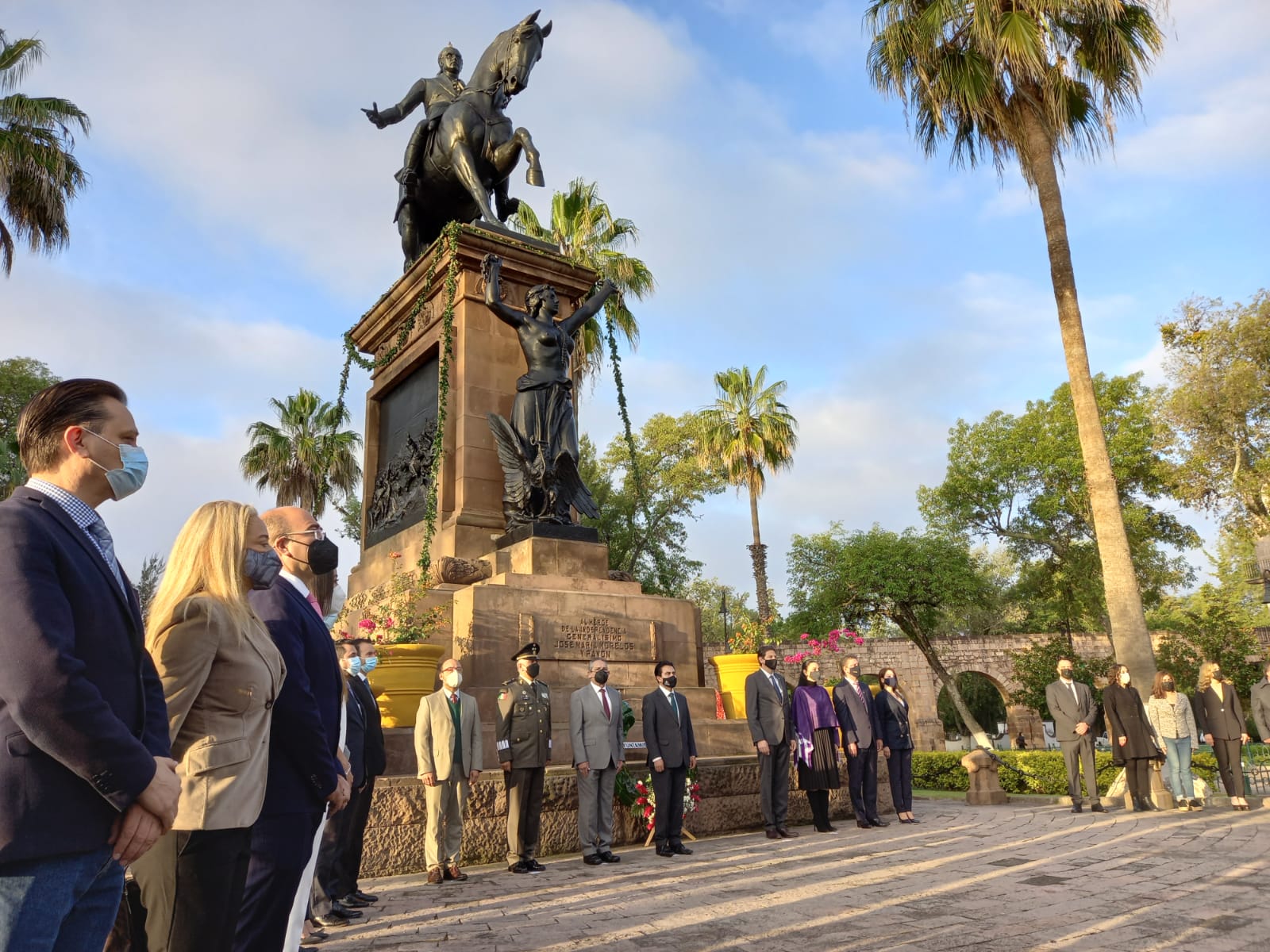 En primer momento, se realizó el izamiento de las tres banderas, la de Michoacán, Morelia y la bandera nacional de México, bajo la dirección de la banda de guerra de la Policía Morelia; posteriormente se realizó la colocación de ofrenda floral y guardia de honor en el monumento ecuestre del Siervo de la Nación en la Plaza Jardín Morelos.