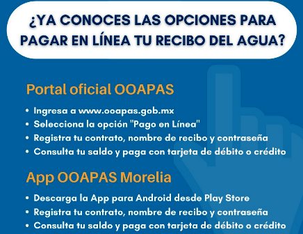 Es así que para recibos vigentes, se puede realizar el pago en cualquier tienda OXXO; mientras que recibos vigentes o vencidos, se podrá pagar a través de la página oficial del OOAPAS o descargando la App “Ooapas Morelia” para sistemas operativos Android.