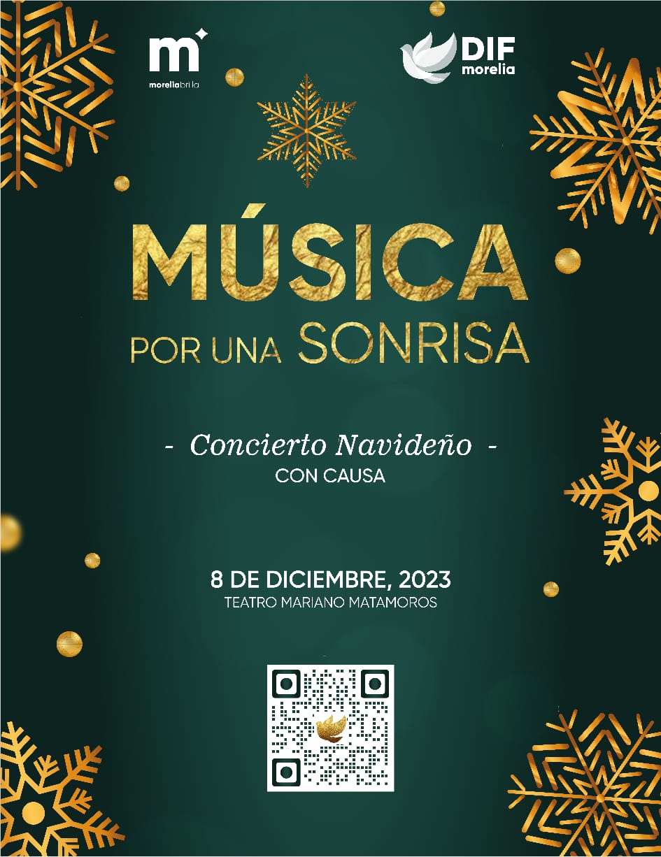 Morelia, Michoacán.- El Teatro Mariano Matamoros está listo para acoger el Concierto Navideño “Música por una sonrisa”, que se celebrará el 8 de diciembre a las 8:00 pm, una iniciativa que promueve la Presidenta Honoraria del DIF Morelia, Paola Delgadillo Hernández.