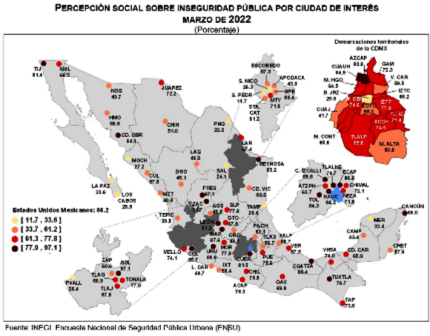 A partir de 2016 se han generado estimaciones representativas por ciudad. En marzo de 2022, las ciudades con mayor porcentaje de personas de 18 años y más que consideraron que vivir en su ciudad es inseguro fueron: Fresnillo, Ciudad Obregón, Zacatecas, Cuautitlán Izcalli, Irapuato y Guadalajara con 97.1, 94.1, 91.7, 89.5, 87.6 y 87.1%, respectivamente.