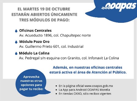 El Organismo Operador de Agua Potable, Alcantarillado y Saneamiento de Morelia (OOAPAS) informa que el próximo martes 19 de octubre se trabajará en la paramunicipal con personal de guardia en tres (03) módulos de pago durante este día, para que los usuarios puedan acercarse a pagar su recibo del agua. Los módulos que estarán activos este martes de las 08:00 a las 14:30 horas, son los siguientes:
