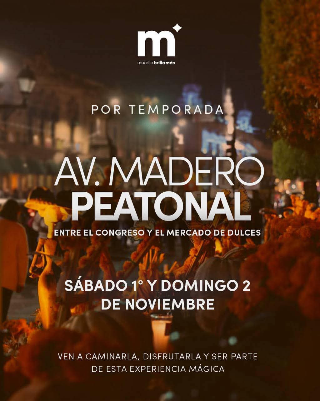 Durante el sábado y el domingo, la avenida Madero, desde la calle El Nigromante hasta Pino Suárez, estará cerrada al tránsito vehicular para que morelianos, morelianas, turistas y visitantes, caminen mayor seguridad y orden.