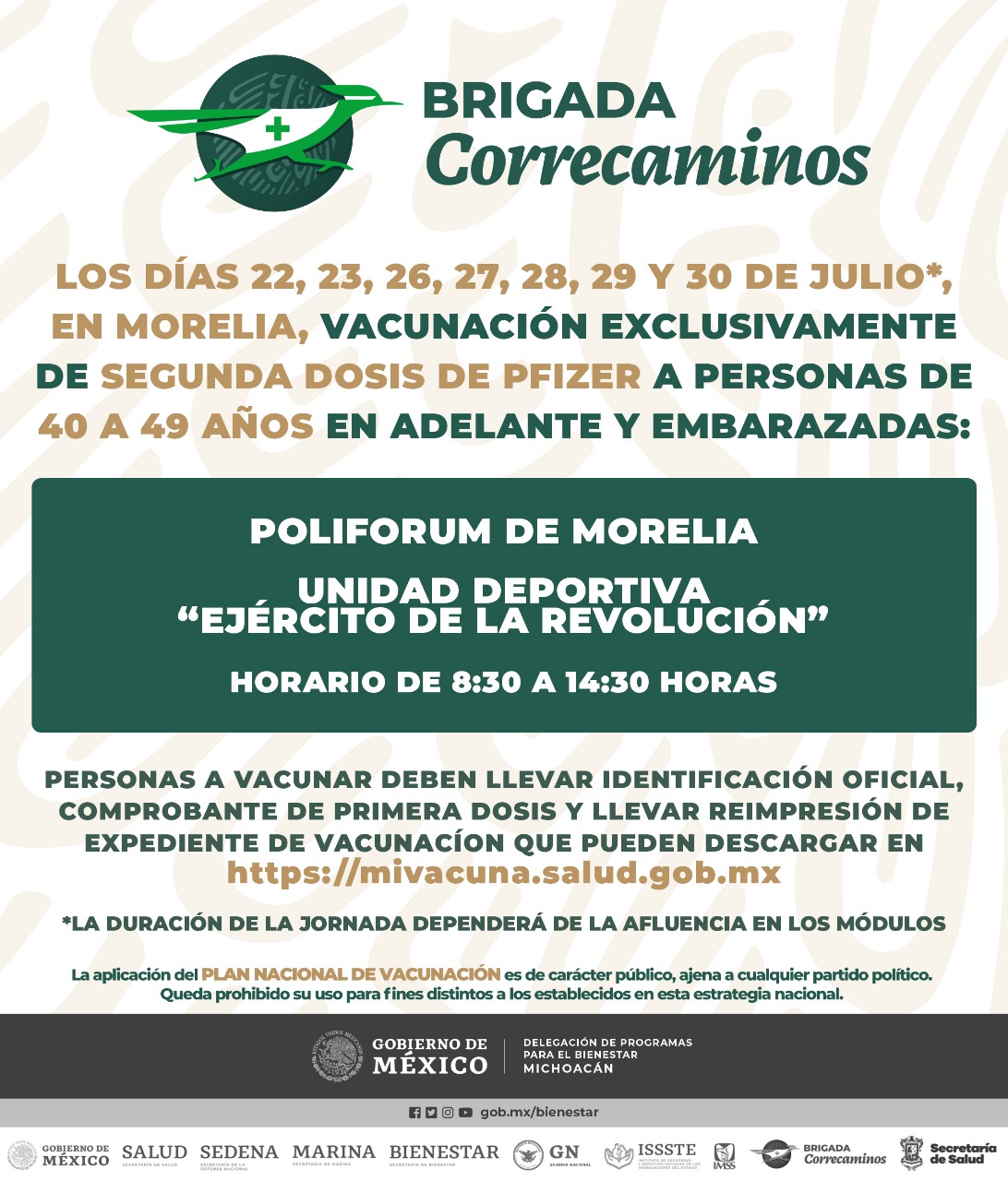 Mencionar que esta jornada de vacunación en Morelia se desarrollará los días 22, 23, 26, 27, 28, 29 y 30 de julio del presente año, lo cual dependerán de la afluencia en los módulos. Si hay cambios, se darán a conocer oportunamente.