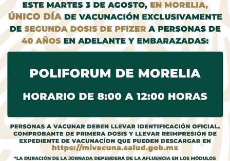 A través de las Brigadas Correcaminos, se dio a conocer que este martes 3 de agosto, será el único día en que estarán aplicándose las segundas dosis de la vacuna Pfizer a todos aquellos adultos de 40 años en adelante que no han completado su esquema de vacunación en la capital michoacana.
