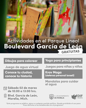 El DIF Morelia informa a la ciudadanía que este sábado 2 de marzo se impartirán talleres lúdicos, recreativos y deportivos en el Boulevard García de León. La jornada, programada de 10:00 am a 1:00 pm, incluye diversas actividades destinadas a fortalecer el tejido social y fomentar la salud y el bienestar de los asistentes.