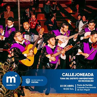 La Calzada Fray Antonio de San Miguel se llenará de música este viernes 22 de abril, a las 19:00 horas, con la Callejoneada que la Secretaría de Cultura de Morelia (SeCultura), ha preparado para habitantes y turistas que aún se encuentren disfrutando de la ciudad de la Cantera Rosa.