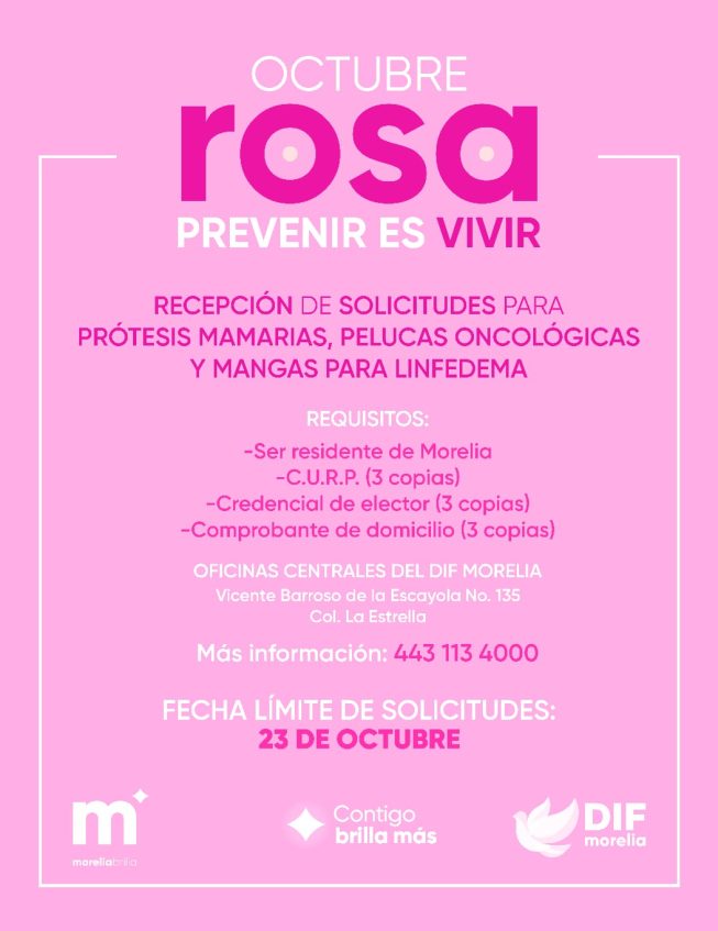 En el marco del cierre del Mes Rosa y con el compromiso de extender de forma permanente la cultura de la prevención del cáncer de mama, el DIF Morelia, que encabeza la Presidenta Honoraria, Paola Delgadillo Hernández, continuará ofreciendo vales gratuitos para mastografías durante todo el año, en colaboración con la UNEME DEDICAM, unidad especializada en el diagnóstico de esta enfermedad.