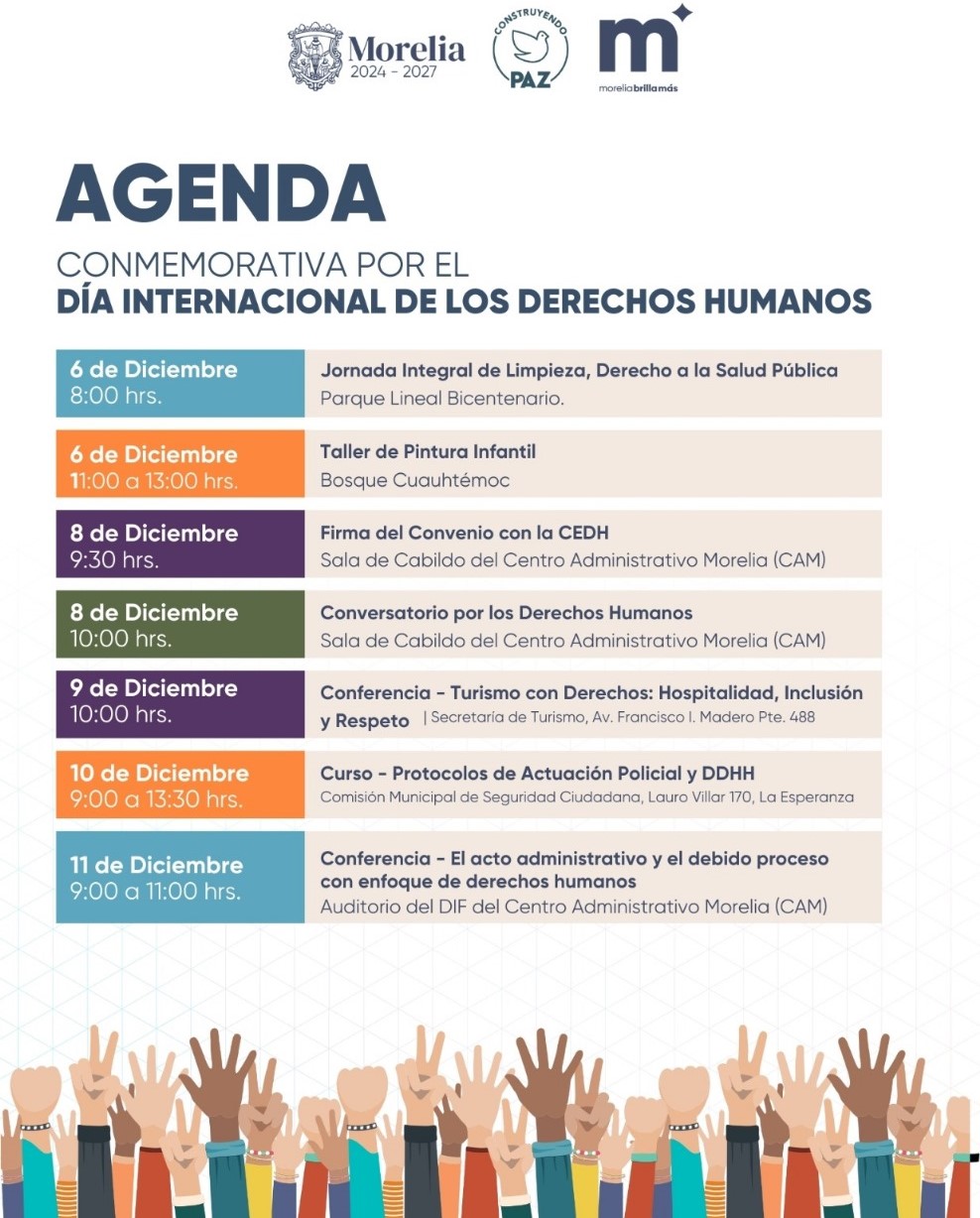 A través de esta agenda, el Gobierno de Morelia refrenda su compromiso de impulsar una ciudad más justa, segura e incluyente, donde los derechos humanos sean una guía permanente en la acción pública, por lo que se invita a la ciudadanía a participar y sumarse a estas actividades que promueven una convivencia basada en el respeto, la paz y la dignidad humana.