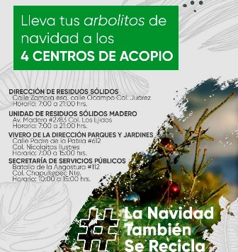 “Lo que se hace con este arbolado es que se tritura y se convierte en composta que después usamos en Parques y Jardines o también lo entregamos a la ciudadanía para que se esparza en plantas, suelos y demás; por lo que con la misma ilusión con la que compraron su arbolito, invitamos a la ciudadanía a llevarlo a los centros de acopio y garantizar con ello un tratamiento para poder reintegrarlo a la naturaleza como composta”, comentó Vázquez Vargas.