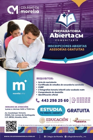 Arranca el Colegio de Morelia su Preparatoria Abierta Comunitaria y con asesorías gratuitas, la cual constará de 22 módulos, las inscripciones ya estan abiertas e iniciará el próximo 13 de febrero del presente año.