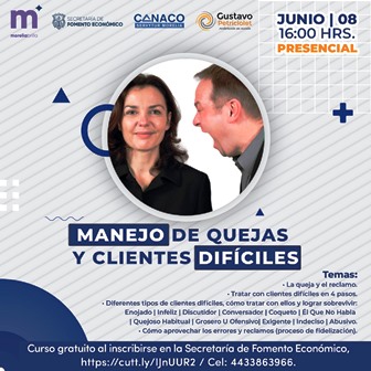 Es así que este próximo 08 de junio se realizará el curso presencial de “Manejo de Quejas y Clientes Difíciles” con el que adquirirán habilidades para tratar a los clientes de manera especial, utilizando la empatía, inteligencia y el tacto, con el cual podrán desempeñar de mejor forma la operatividad de sus empresas o negocios, mediante herramientas útiles, eficaces y actuales para aumentar la productividad. Éste, iniciará en punto de las 4:00 de la tarde y concluirá a 8:00 de la noche.