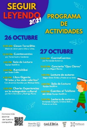 Biblioteca GaLEEría y el Ayuntamiento de Morelia, invitan a las y los morelianos al evento de recaudación “Seguir Leyendo” 2021″, este 26 y 27 de octubre, que se realizará en el Andador Nigromante, donde se presentarán diversas actividades como cuentacuentos, charlas, conciertos musicales, clown y más.