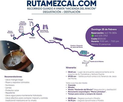 Cabe destacar que el punto de partida será a las 09:00 horas, en el lugar conocido como «La Paloma” ubicada en la avenida Ventura Puente de la ciudad de Morelia, para regresar a las 18:00 horas aproximadamente. El costo del recorrido será de 500 pesos e incluye traslado en un Safari móvil, las visitas a los lugares mencionados anteriormente y una explicación de la producción del mezcal a cargo de maestros mezcaleros.