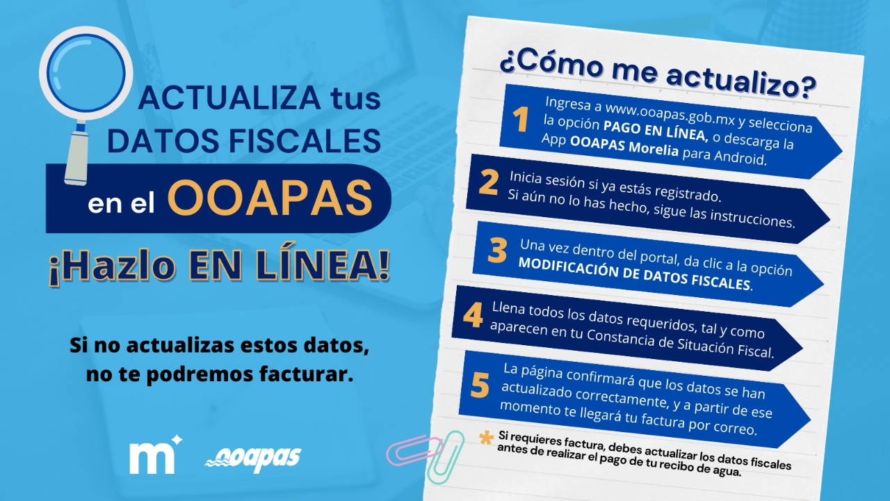 El Organismo Operador de Agua Potable, Alcantarillado y Saneamiento de Morelia (OOAPAS) lanza hoy la campaña “Actualiza tus datos fiscales en el OOAPAS. ¡Hazlo en línea!”, donde se les invita a las y los usuarios a actualizar sus datos fiscales, para facturar su recibo de agua. Este trámite se puede realizar en línea ingresando a la página oficial de la paramunicipal, o en la App OOAPAS Morelia, para sistemas Android.