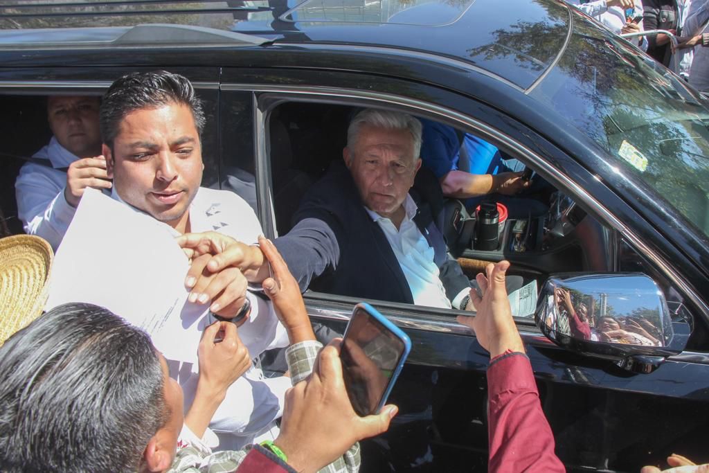 El presidente hizo una breve parada antes de iniciar la reunión que se realiza con personal de la Secretaría del Bienestar en el CECONEXPO.