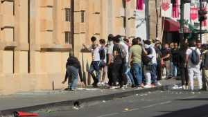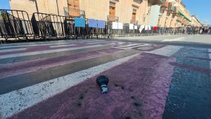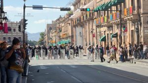 Los ánimos subieron de tono cuando por un costado del contingente del lado de catedral ingresó un numeroso grupo de muchachos, en su mayoría con el rostro cubierto, quienes se mezclaron con los universitarios y comenzaron a lanzar piedras, pedazos de fierro y madera en contra de la fachada que se encontraba resguardada por vallas metálicas, al tiempo que gritaban, “fuimos todos, fuimos todos”.