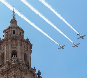 De lo más llamativo fue el paso de las aeronaves T6C de la Fuerza Aérea Mexicana, que en cinco ocasiones surcaron el cielo sobre el primer cuadro de la ciudad