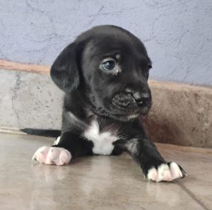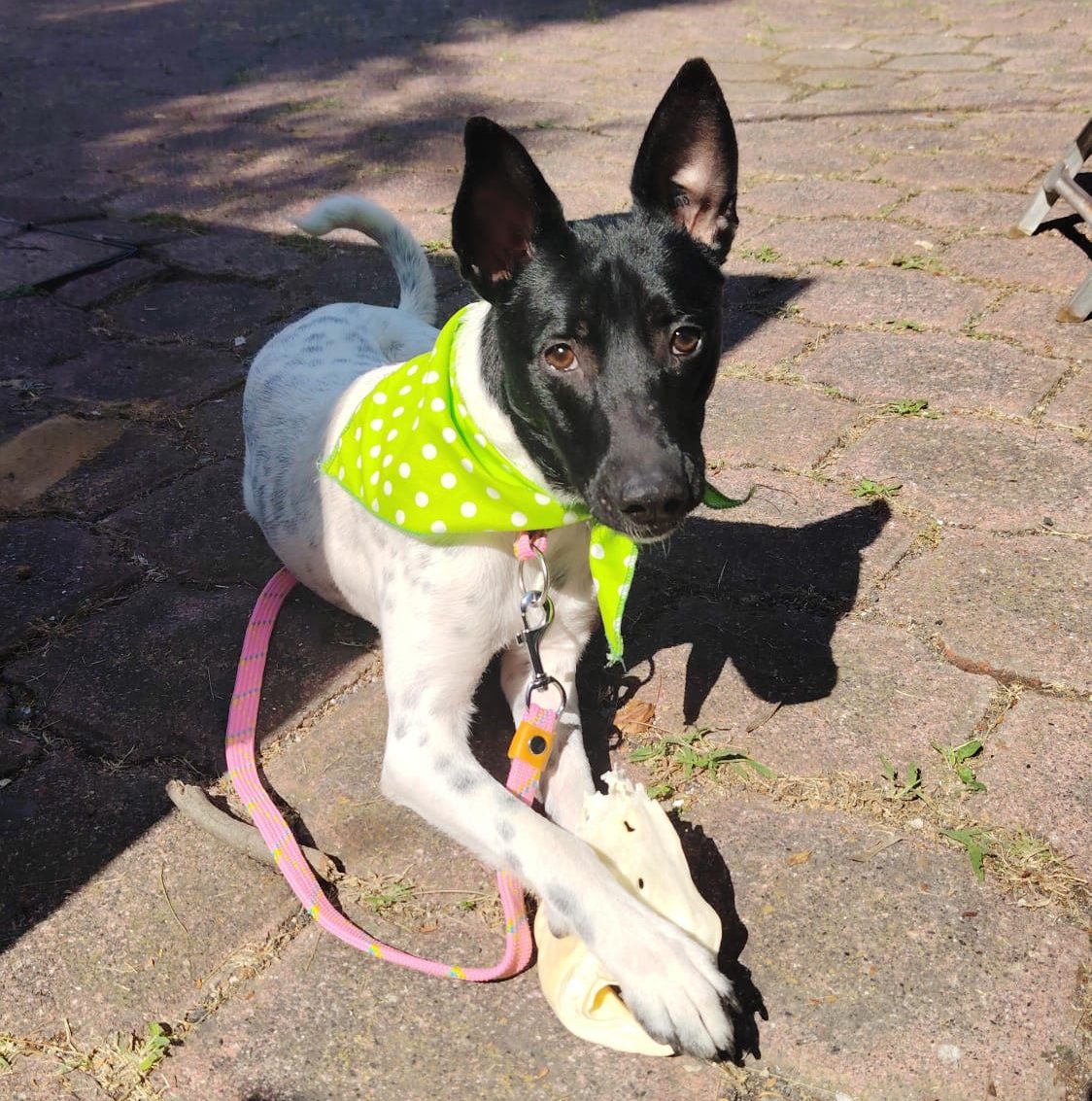Su cuerpo blanco y su cabeza negra la hacen destacar de inmediato, sin embargo, su corta edad la llena de energía, de ganas de jugar y de vivir, cualidades que no todos están dispuestos a comprender.
