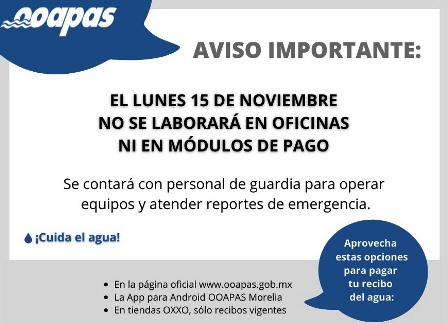 El Organismo Operador de Agua Potable, Alcantarillado y Saneamiento de Morelia (OOAPAS) informa que de acuerdo con el calendario oficial, el próximo lunes 15 de noviembre será día inhábil, por lo que no se laborará en oficinas administrativas ni módulos de pago de la paramunicipal.