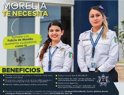 Tanto los documentos a presentar como los requisitos de ingreso para las y los interesados, los podrán encontrar en la convocatoria oficial disponible en las redes sociales de la Policía de Morelia en Facebook, Twitter e Instagram. Cualquier duda también puede ser consultada a través del teléfono 443 113 500 extensión 164 o 181.