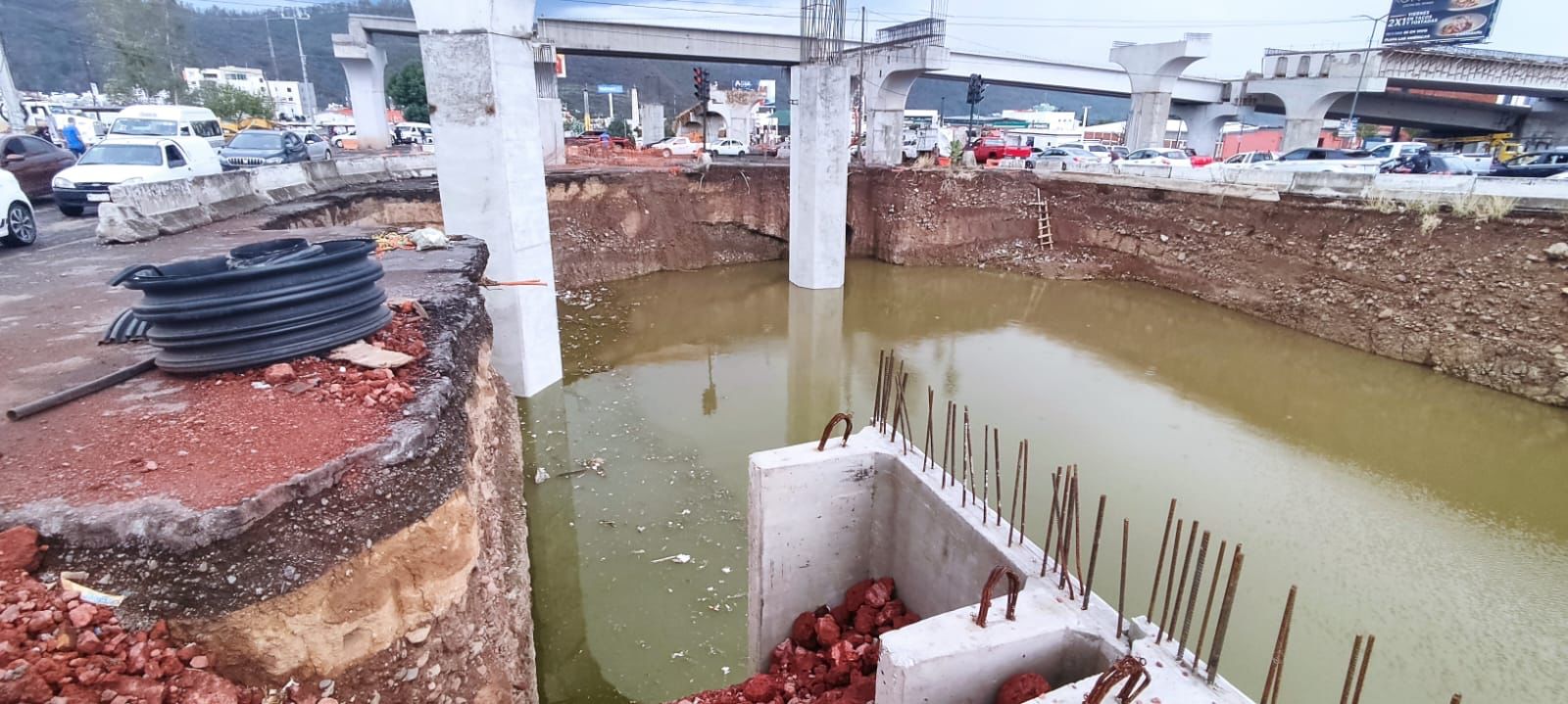 Tras las lluvias que se han estado presentado en los últimos días, se ha notado el poco avance que están registrando las obras de los distribuidores viales, principalmente el de salida a Mil Cumbres que se ha convertido en una alberca en la zona donde se ubica lo que será el paso a desnivel.