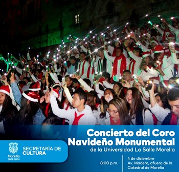 Organizado por la administración municipal del alcalde, Alfonso Martínez Alcázar, a través de la Secretaría de Cultura de Morelia que dirige Fátima Chávez Alcaraz, la ciudadanía podrá habitar el espacio público en aras de la construcción y fortalecimiento de una cultura de paz, con el concierto que el Coro Navideño Monumental de la Universidad La Salle, ofrecerá con apoyo de la SeCultura a las 8:00 de la noche en la Avenida Madero frente a la Catedral.