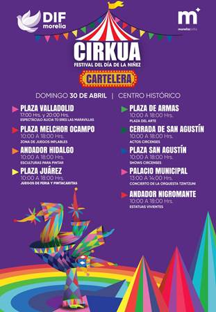 El DIF Morelia, que encabeza Paola Delgadillo Hernández, en colaboración con las distintas dependencias del Gobierno Municipal, invita a todas las familias a unirse a la celebración del Día de la Niñez en el festival «Cirkua», que se llevará a cabo el próximo domingo 30 de abril en el Centro Histórico de Morelia.