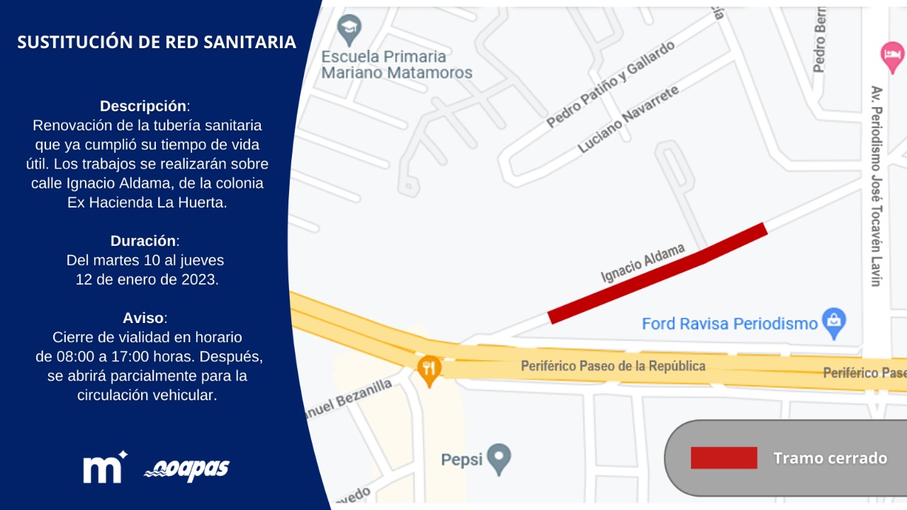 Como parte de las acciones para mejorar los servicios básicos de la ciudad, el Organismo Operador de Agua Potable, Alcantarillado y Saneamiento de Morelia (OOAPAS), renovará 100 metros de red sanitaria ubicada sobre la calle Ignacio Aldama de la colonia Ex Hacienda La Huerta. Los trabajos se llevarán a cabo del martes 10 al jueves 12 de enero.