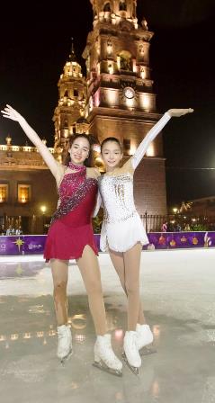 Para cerrar con broche de oro las espectaculares presentaciones que engalanaron la pista de hielo que colocó el DIF Morelia, que encabeza la presidenta Paola Delgadillo Hernández, este viernes, el dúo de hermanas patinadoras Alejandra Osuna y Camila Pérez dieron un show que dejó en el asombro al público asistente.