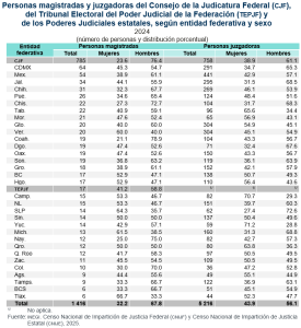 Al cierre de 2024, a nivel nacional se reportaron mil 416 personas magistradas: 32.2 % mujeres y 67.8 % hombres. Asimismo, se registraron 5 mil 216 personas juzgadoras: 43.9 % mujeres y 56.1 % hombres.