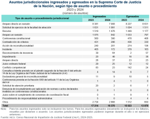 Durante 2024, ingresaron 16 mil 370 asuntos jurisdiccionales a la SCJN y egresaron 13 mil 979. Al comparar con 2023, la cantidad total de asuntos jurisdiccionales ingresados y egresados disminuyó 4.9 y 6.9 %, respectivamente. Según el tipo de asunto o procedimiento jurisdiccional, la mayor proporción correspondió al amparo directo en revisión, con 48.3 % en los asuntos ingresados y 61.7 % en los egresados.