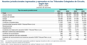 En 2024, ingresaron 428 mil 572 asuntos jurisdiccionales a los Tribunales Colegiados de Circuito (TCC) y egresaron 387 mil 798. En comparación con 2023, la cantidad de asuntos ingresados y egresados disminuyó 18.7 y 18.0 %, respectivamente. Según el tipo de asunto jurisdiccional, la mayor proporción correspondió al amparo directo, con 45.3 % en los asuntos ingresados y 40.6 % en los egresados. La cantidad de amparos directos ingresados a los TCC disminuyó 6.9 % en relación con 2023.