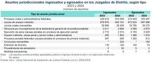 En el mismo periodo, los asuntos jurisdiccionales más frecuentes que atendieron los Juzgados de Distrito (JD) fueron los procesos civiles o administrativos federales, con 810 mil 259 asuntos ingresados y 793 mil 457 egresados. Siguieron los juicios de amparo indirecto, con 640 mil 161 ingresos y 597 mil 068 egresos. En contraste con 2023, la cantidad de ingresos de procesos civiles o administrativos federales aumentó 252.4 %, mientras que la de juicios de amparo indirecto disminuyó 5.4 %.