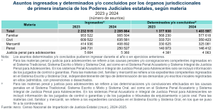 Durante 2024 a nivel nacional se reportaron 2 millones 205 mil 864 asuntos ingresados y un millón 403 mil 597 determinados y/o concluidos por los órganos jurisdiccionales de los PJE en las materias penal, justicia para adolescentes, civil, familiar y mercantil. Con respecto a 2023, los asuntos ingresados disminuyeron 1.2 % y los determinados y/o concluidos aumentaron 1.9 %.
