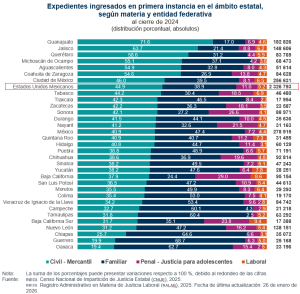 Guanajuato (71.6) y Jalisco (63.7) destacaron con los porcentajes más altos de expedientes ingresados en materia civil y mercantil. Por su parte, en Oaxaca, Guerrero y Chiapas más de 60.0 % de los expedientes ingresados fueron en materia familiar. La materia laboral representó menos de 10.0 % de los expedientes ingresados en todas las entidades federativas.