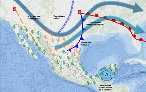 Este día, el frente frío núm. 34 recorrerá el norte y noreste del territorio nacional, asociado con una vaguada en altura y las corrientes en chorro polar y subtropical, lo cual propiciará un refrescamiento de las temperaturas, así como vientos fuertes con posibles tolvaneras en las regiones mencionadas. En el resto del país, un anticiclón en niveles medios de la atmósfera mantendrá ambiente cálido a caluroso durante la tarde, con temperaturas superiores a 30 °C, en 26 entidades de la República Mexicana, además de baja probabilidad de lluvias.