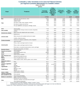 En enero de 2026, los cambios porcentuales mensuales de las Líneas de Pobreza Extrema por Ingresos (LPEI), referentes a la canasta alimentaria, fueron de 0.5 % en el ámbito rural y de 0.8 % en el urbano. El rubro de refrescos de cola y de sabores fue el de mayor incidencia en la variación en el ámbito rural y en el urbano fue el de alimentos y bebidas consumidas fuera del hogar. En segundo lugar, en el ámbito rural, fue el de limón y en el urbano, el de refrescos de cola y de sabores. Por último, el tercer rubro con mayor incidencia en el ámbito rural fue el de alimentos y bebidas consumidas fuera del hogar y, en el urbano, el de limón.