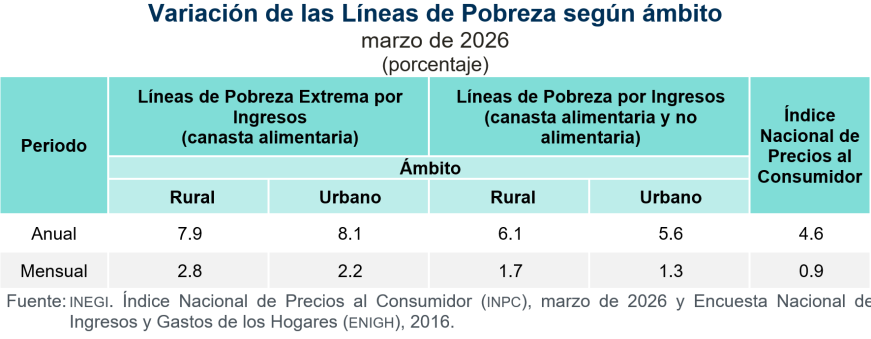 El Instituto Nacional de Estadística y Geografía (INEGI) actualiza las Líneas de Pobreza (LP) correspondientes a marzo de 2026, según ámbitos rural y urbano. Estas ofrecen un referente monetario que determina si los ingresos de la población son suficientes para adquirir bienes, servicios y alimentos que conforman las canastas alimentaria y no alimentaria.