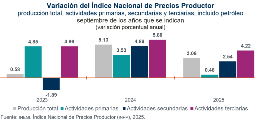 En septiembre de 2025, por grandes grupos de actividades económicas, los precios de las primarias ascendieron 1.43 % a tasa mensual y bajaron 0.33 % a tasa anual. Los de las secundarias cayeron 0.11 % a tasa mensual y subieron 3.77 % a tasa anual. Los precios de las actividades terciarias incrementaron 0.16 % a tasa mensual y 3.63 % a tasa anual.