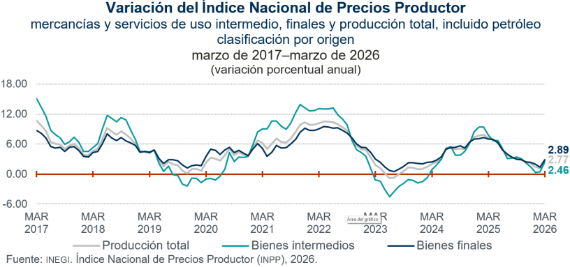 En marzo de 2026, el INPP total, incluido petróleo, incrementó 1.72 % a tasa mensual y 2.77 % a tasa anual. En el mismo mes de 2025, creció 0.08 % a tasa mensual y 7.22 % a tasa anual.