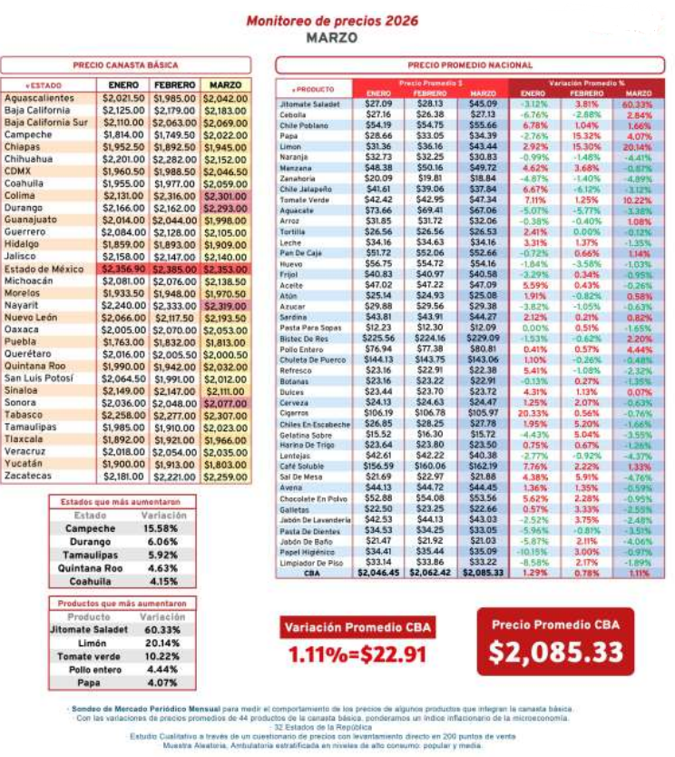 Los cinco estados en donde la CBA presenta mayor variación de precios fueron Campeche (15.58%), Durango (6.06%), Tamaulipas (5.92%), Quintana Roo (4.63%) y Coahuila (4.15%). En tanto, los estados en donde la CBA resultó más cara fueron Estado de México $2,353.00, Nayarit $2,319.00, Tabasco $2,307.00, Colima $2,301.00 y Durango $2,293.00.