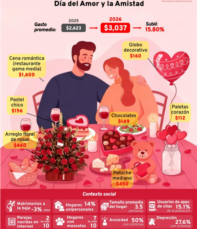 “Pese al contexto económico complejo, la fecha no pasa desapercibida, se continúa celebrando, aunque eso sí, con ajustes importantes en las compras; huelga señalar que son los menos quienes obsequian toda esta gama de presentes, la mayoría se deciden por unos u otros, priorizando el valor del detalle sobre el valor económico del regalo, reflejándose una clara realidad: no existe desinterés en la celebración del Día del Amor y la Amistad, sino una menor capacidad de compra frente al encarecimiento generalizado”, explicó Cuauhtémoc Rivera, presidente de ANPEC.