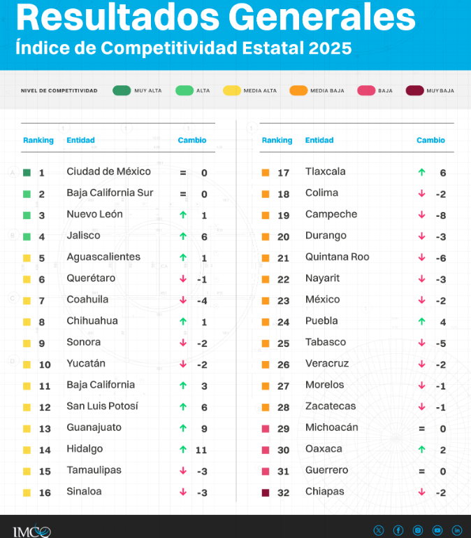 El proyecto de decreto del gobierno del Estado, basado en cifras del Instituto Mexicano para la Competitividad (IMCO) para el ejercicio fiscal 2026, expone que Michoacán permanece en la posición número 29 del Índice de Competitividad Estatal 2025, colocándose entre las entidades con mayor rezago del país.