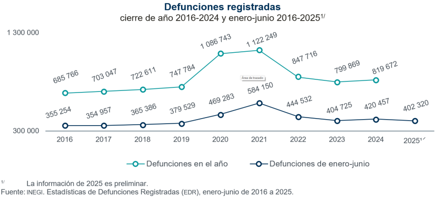De enero a junio de 2025, se registraron 402 mil 320 defunciones. Para este año se observó un decremento de 18 mil 137 muertes respecto a las registradas en el mismo periodo de 2024. Del total de defunciones registradas, 384 mil 715 ocurrieron en 2025; las restantes, en años anteriores.