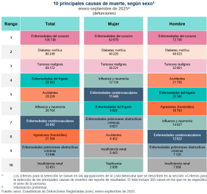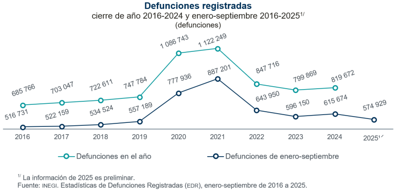 De enero a septiembre de 2025 se registraron 574 mil 929 defunciones. Se observó un decremento de 40 mil 745 muertes respecto a las registradas en forma definitiva en el mismo periodo de 2024. Del total de defunciones registradas, 555 mil 269 ocurrieron en 2025; las restantes, en años anteriores.