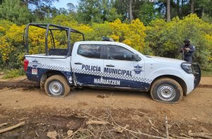 Nahuatzen, Mich.- Presuntos criminales atacaron con armas largas y explosivos arrojados desde drones a elementos de la Policía Municipal de Nahuatzen en un camino de terracería; afortunadamente, los uniformados resultaron ilesos.