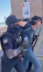 La orden era clara: golpear jóvenes y periodistas por enésima vez. La Guardia Civil al mando del cuestionado Juan Carlos Oseguera Cortés volvió a hacer de las suyas: sus elementos se esperaron a que se retirara casi la mayoría de quienes participaron en la numerosa marcha de este día, mientras jóvenes se quedaron afuera de Catedral frente al exageradamente resguardado Palacio de Gobierno donde siguieron gritando consignas de «no somos bots» y en contra de Morena y sus gobernantes.