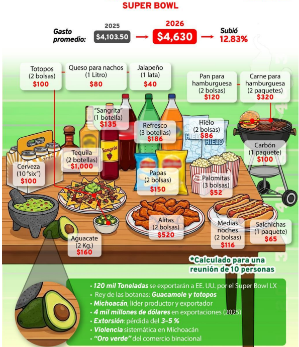 Desde la óptica del gasto familiar, disfrutar el Super Bowl LX en casa implica un esfuerzo económico cada vez mayor. De acuerdo con el sondeo realizado por la Alianza Nacional de Pequeños Comerciantes (ANPEC), una reunión de diez personas con un menú básico de botanas y bebidas: hot dogs, cerveza, papas de bolsa, totopos, guacamole y refrescos, puede representar un desembolso de hasta 2 mil 161 pesos. Cuando se incluyen bebidas como tequila y mayor variedad de alimentos, como palomitas, nachos, alitas y hamburguesas, el gasto total podrá ascender a 4 mil 630 pesos.