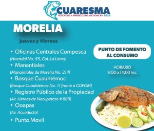 Destacó que el programa de Cuaresma incluye el que se tendrán puntos de venta en Morelia en los puntos tradicionales, como son a las afueras del OOAPAS, el bosque de Cuauhtémoc, y en la tenencia de Santa María, los días jueves y viernes de 8:00 a 14:00 horas, mientras que en las oficinas de la COMPESCA será todos los días en el mismo horario.